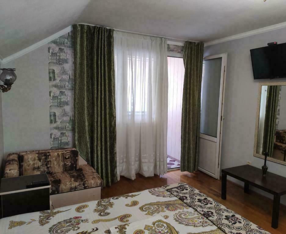 Домик с отдельным входом, террасой и ванной комнатой. В номере большая двуспальная кровать и два дивана-кровати, стол, стулья, журнальный столик, телевизор, холодильник, электрический чайник, фен и кондиционер.